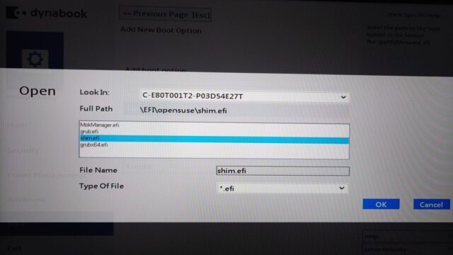 dynabook の UEFI は efi ファイルを直接指定して UEFI エントリーを追加することができます。この機能で shim.efi (セキュアブート用のプリブートローダー)を指定して起動順序を先頭にしたところ、無事に起動するようになりました。