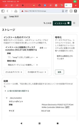 Leap 16.0 で導入された Agama インストーラーは Web アプリケーションになっており、fail safe モードの場合は、ネットワーク越しにインストーラーにアクセスして操作を行えます。スクリーンショットはタブレットで操作している様子です。